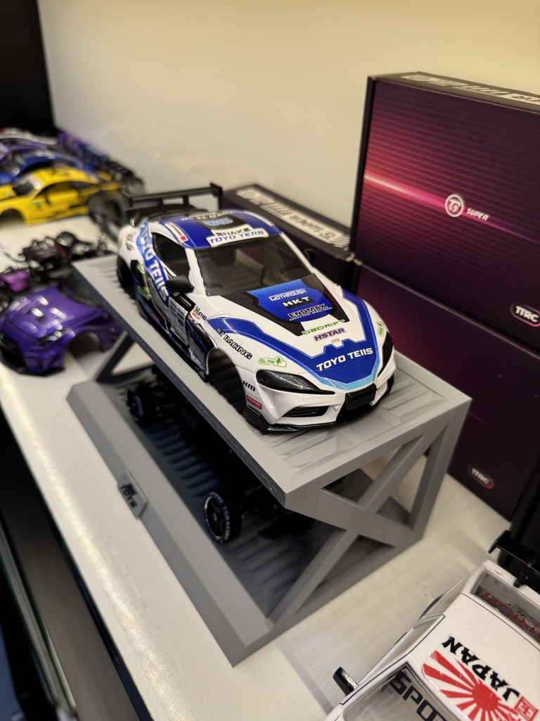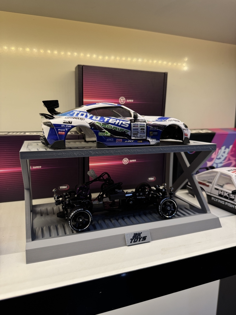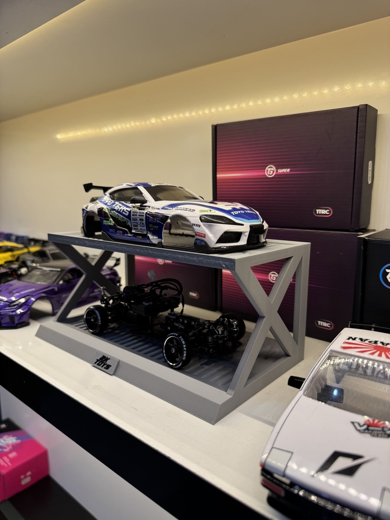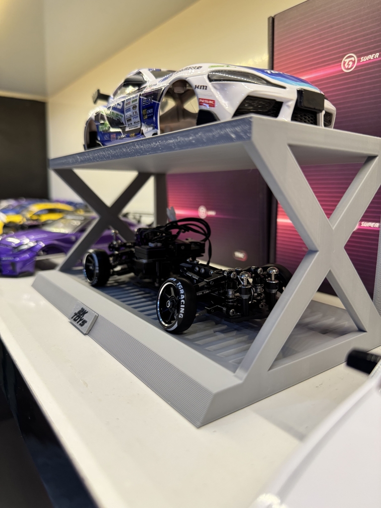 Thiết kế vững chãi: Cấu trúc khung chữ X đan chéo mang lại vẻ ngoài cơ khí mạnh mẽ, đảm bảo độ chịu lực tốt khi đặt các dòng xe mô hình tĩnh hoặc xe RC 1/24 nặng.